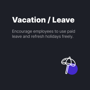 ![]() | Vacation/Leave Encourage employees to use paid leave and refresh holidays freely. |