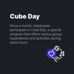 ![]() | Cube Day Once a month, employees participate in Cube Day, a special program that offers various group experiences and activities during work hours. |