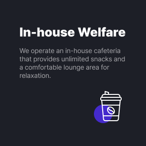 ![]() | In-house Welfare We operate an in-house cafeteria that provides unlimited snacks and a comfortable lounge area for relaxation. |